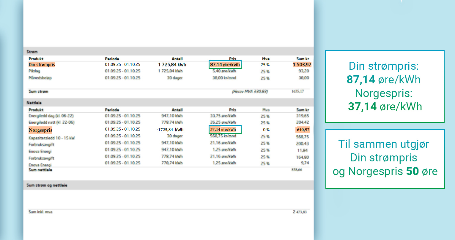 Ser du på summen for din strømpris fra strømleverandøren din og Norgesprisstøtten på nettleie fakturaen skal den bli 50 øre/kWh. (Ekskludert påslag, gebyrer og avgifter.)